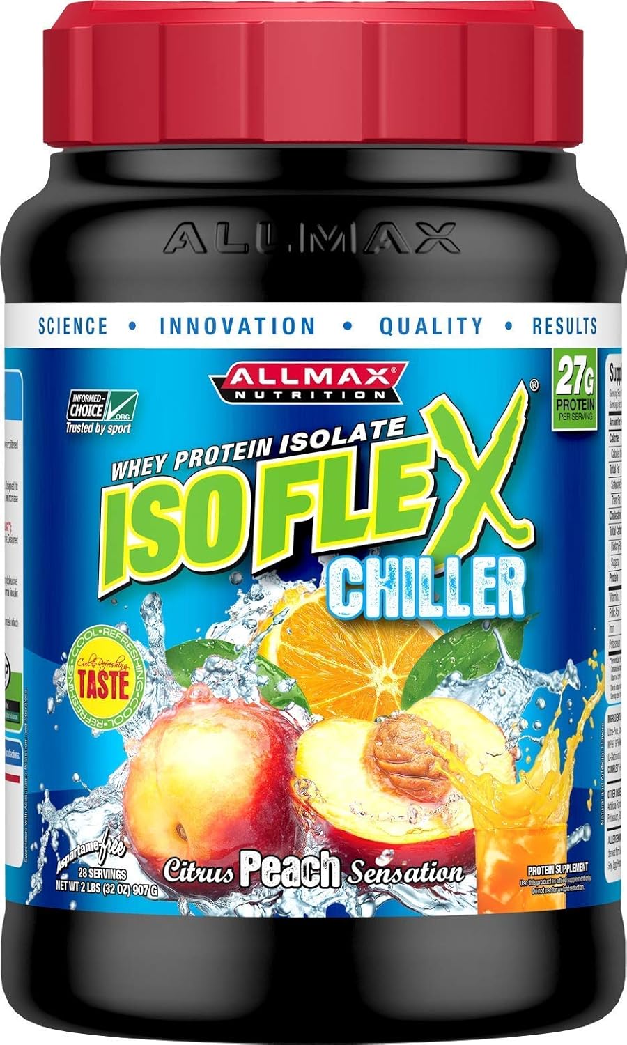 It’s hot outside, you’ve just finished an intense workout, and the last thing you want to do is step out into the heat and down a protein shake. If this sounds familiar, thankfully Allmax Nutrition has the perfect solution for you! Introducing Isoflex Chiller, the same Isoflex you’ve come to love, except in a refreshing juice-style drink! That’s right, simply mix Isoflex Chiller with ice cold water and you’ve got a delightfully delicious fruity drink – getting your protein after your workout has never been easier. Featuring 27g of Protein per scoop, drinking Isoflex Chiller immediately after your training session will not only improve your post-workout recovery, but it will also stimulate ant-catabolic activity, increasing your overall lean muscle growth. What’s more, Isoflex Chiller is loaded with BCAAs (Branched Chain Amino Acid) and EAAs (Essential Amino Acids) which further help accelerate protein synthesis and the rate of lean muscle growth. The best part of Isoflex Chiller is not only the taste, but its stellar macronutrient profile – ZERO carbs, fats, or sugars in this formula! No matter what your fitness goals are – if you are bulking, cutting, or maintaining, protein is an essential component of a healthy diet and is necessary to build lean muscle. Like all products from Allmax Nutrition, Isoflex Chiller is produced in a cGMP facility and is put through a rigorous 5-stage quality control process to ensure that you are getting only the finest ingredients at their most efficacious doses. If you’re tired of the same old protein shake after your workout, its time to give Isoflex Chiller a try. With a delicious and refreshing citrus peach flavor, getting your protein in after your training has never been easier or more delicious. Order your tub of Allmax Nutrition’s Isoflex Chiller today!