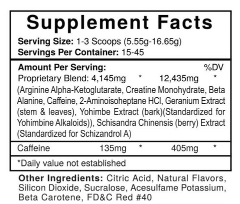 (Arginine Alpha-Ketoglutarate, Creatine Monohydrate, Beta Alanine, Caffeine, 2-Aminoisoheptane HCl, Geranium Extract (stem & leaves), Yohimbe Extract (bark) (Standardized for Yohimbine Alkaloids), Schisandra Chinensis (berry) Extract (Standardized for Schizandrol A))Caffeine: 135 mg / 405 mg †