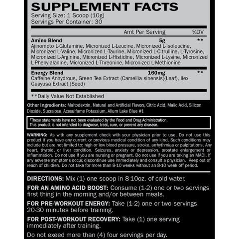Hi-Tech Pharmaceuticals recommends mixing two (2) Scoops in 8-10 Ounces of cold Water. For an Amino Acid boost, consume one or more Scoops first thing in the morning and/or between Meals. For pre-workout energy, take one to two Scoops 20-30 minutes before training.