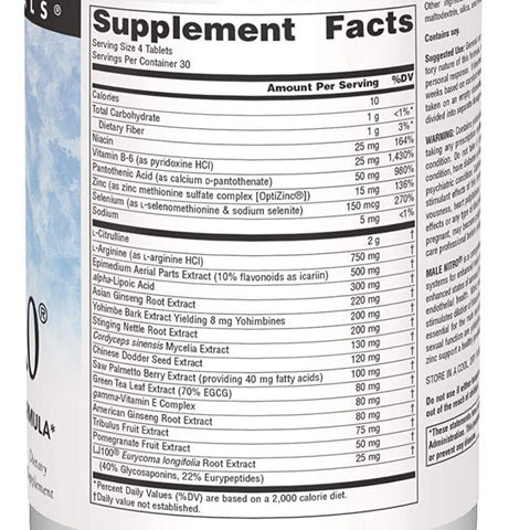 General use is 1 to 4 tablets daily. Due to the stimulatory nature of this formula, start with 1 to 2 tablets per day to assess personal response. If desired, gradually increase over the course of two weeks based on comfort level. Do not exceed 4 tablets per day. Best if taken on an empty stomach, 1 hour prior to sexual activity. May be divided into separate dosage occasions; for example, twice per day.