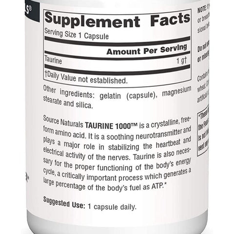 Source Naturals Taurine 1000 is a crystalline, free-form amino acid. It is a soothing neurotransmitter and plays a major role in stabilizing the heartbeat and electrical activity of the nerves. Taurine is also necessary for the proper functioning of the body’s energy cycle, a critically important process which generates a large percentage of the body’s fuel as ATP.